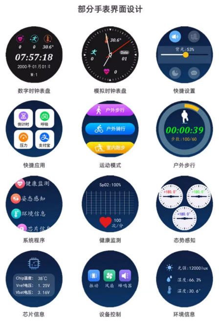 智能可穿戴設備集成了監測感知、運算處理、顯示等功能,可以佩戴在身上,是具備智能功能和交互能力的電子產品。常見的有智能手表/手環、智能戒指、智能眼鏡、智能服飾等產品。以智能手表為例,其主要功能包括健康監測、運動模式、環境檢測、電池電量檢測、RTC時鐘、狀態提醒、模式切換(運行/待機,LPBAM功能演示)和網絡連接等功能。參賽者可以基于手表項目案例結合自己的創新進行拓展。