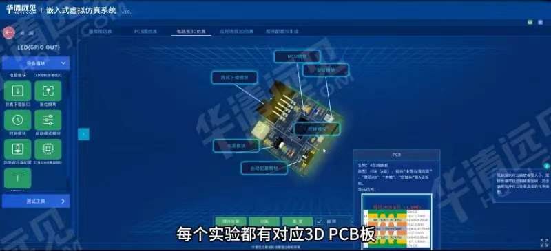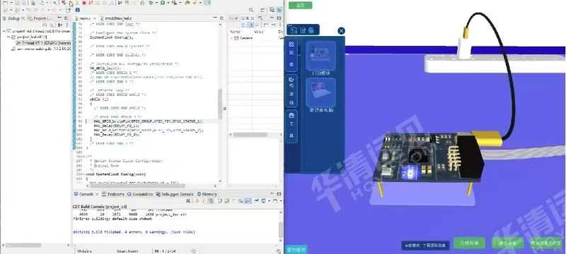 華清遠見嵌入式虛擬仿真系統以3D模型1:1還原了嵌入式硬件系統和豐富的傳感器、執行器,模擬了真實的硬件和項目應用場景,把多個硬件都放在仿真軟件里,脫離硬件去教學,能夠讓學生在無需實際硬件的情況下,通過模擬界面來學習并進行實驗。老師也能夠輕松引導學生探索不同硬件組件的功能與交互,并根據實際教學需求快速切換不同的硬件配置進行教學演示,降低硬件成本和管理復雜度的同時還提高了教學效率。