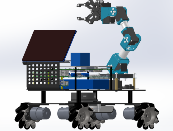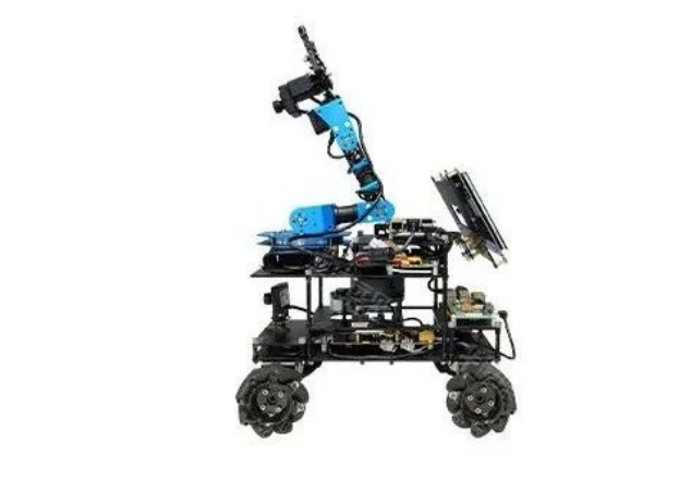 3.輪式車輛:這是一款基于ROS系統的高性能智能移動機器人平臺,集成了激光雷達與麥克納姆輪全向移動系統,具備自主建圖、實時避障與精準導航能力。機器人搭載六自由度機械臂,配備雙目視覺系統,可實現目標識別、距離測量與動態跟蹤。通過運動學正逆解算法與PID控制策略,機械臂能夠完成對目標物體的自主抓取與精確操作,具有高穩定性、高精度與良好的實時響應性能,展現了在服務機器人、工業自動化等領域的廣泛應用前景。