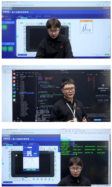 課程采用“大屏理論講解+虛擬仿真實操”雙平臺模式:講師結合企業案例拆解抽象技術,實操環節依托仿真系統,在線完成Ubuntu24.04環境搭建、VSCode配置及程序調試,每個模塊配套專屬實驗,實現“邊學邊練”。同時講師分享課程設計思路與資源包,助力教師快速轉化為校本教學方案。