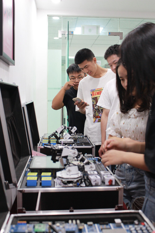開班典禮上,華清遠見成都中心校企合作部的老師為同學們介紹了華清的基本情況,并闡述了此次實訓的目的和價值,以及接下來的實訓安排和注意事項等等。隨后華清的老師帶領著高校學子們依次參觀了成都中心的教學和教室環境、并走進華清遠見成都基地AI(人工智能)智慧展廳,為同學們講解了智能物聯網系統、開源智能穿戴試驗箱、人工智能教學實驗平臺等多種設備。帶領大家感受眾多酷炫好玩高科技。
