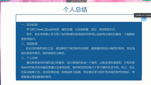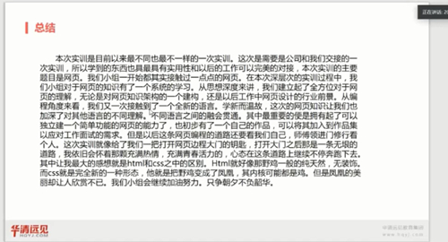 本次實訓項目是《包含html+css+js(jQuery)的網頁前端開發項目》,由華清遠見成都中心李老師教學,并配備了項目經理和教務管理人員,在華清遠見自主研發的在線教育平臺——華清創客學院上進行直播教學,學子們感受到了全面、專業的線上學習體驗,學習熱情始終飽滿,學習效率和成果也同樣優秀!