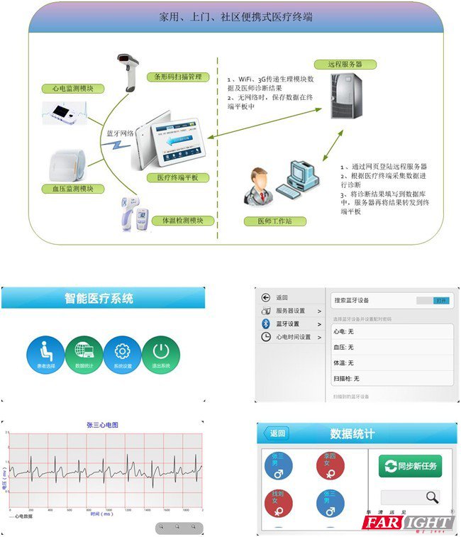 便攜式智能醫療系統基于最新的物聯網技術及移動平臺終端,總結傳統醫療設備的優缺點,適應國家衛生部門提倡基礎醫療設備入社區,即:社區醫療的建議,而研發出來的新型終端醫療設備系統。它具有:攜帶方便(適合社區上門服務)、功耗。ㄡt療設備全部電池供電)、運行穩定(使用目前最先進的醫療傳感器技術)、操作方便(專門個性化定制操作系統)、病歷及病情智能分析(通過報表及各種圖例展示病情及病歷)、遠距離專家診療等優點,同時,大大提高社區醫護人員工作效率。