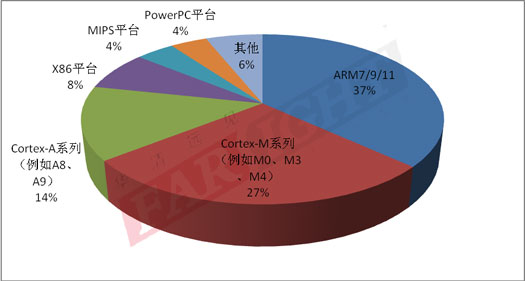 從2013-2014年度的調(diào)查統(tǒng)計(jì)數(shù)據(jù)中可以看到, ARM處理器(包括ARM7/9/11、Cortex-M系列、Cortex-A系列)毫無疑問地占據(jù)了嵌入式處理器絕大部分的市場(chǎng)份額(78%),在ARM及其合作伙伴的市場(chǎng)推動(dòng)下,ARM7/9/11較前一年的統(tǒng)計(jì)結(jié)果,出現(xiàn)了連續(xù)的下滑,市場(chǎng)份額下降了4個(gè)百分點(diǎn),而新的定位高端的ARM-A系列、定位低端的ARM-M系列則有一定程度的增長(zhǎng),已毋庸置疑地成為ARM處理器應(yīng)用的主流。隨著物聯(lián)網(wǎng)產(chǎn)業(yè)的快速發(fā)展,對(duì)低功耗微控制器的需求必然會(huì)更進(jìn)一步地推動(dòng)Cortex-M系列處理器的快速應(yīng)用,而高性能智能手機(jī)、平板電腦及更多智能終端設(shè)備的開速普及則使得Cortex-A系列處理器獲得了快速發(fā)展的機(jī)會(huì)。