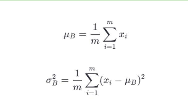 給定一個小批量的數據 x={x1,x2,...,xm},其中 m 是小批量的大小。首先計算該小批量數據的均值 μB 和方差 ��2σB