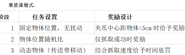 任務特性:僅在抓取成功時給予正獎勵(+1),其余時刻無反饋(0)。