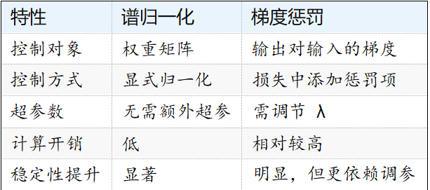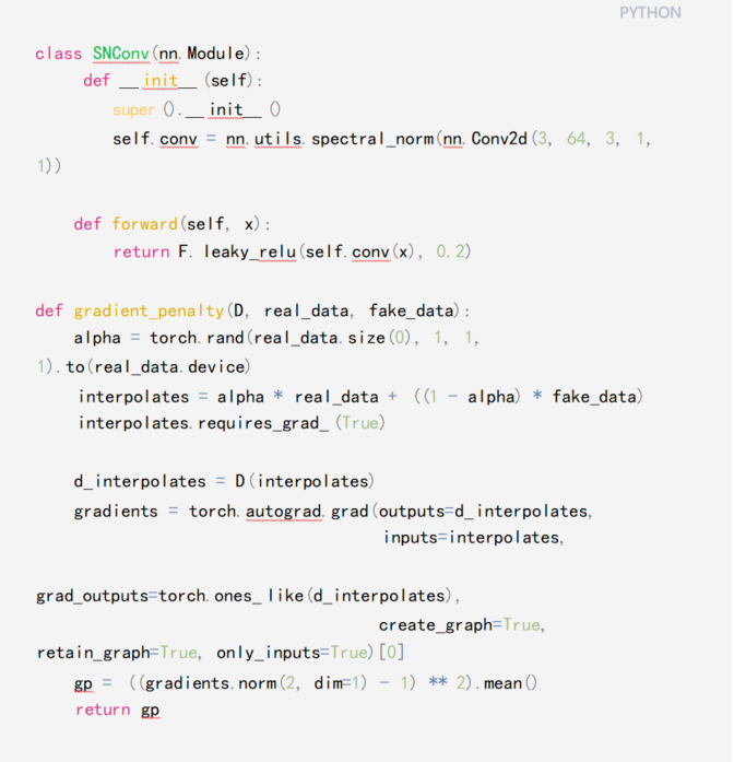 在實際中,兩者結(jié)合使用可以取長補(bǔ)短。譜歸一化控制網(wǎng)絡(luò)整體尺度,而梯度懲罰則精 細(xì)約束輸入輸出的敏感度。