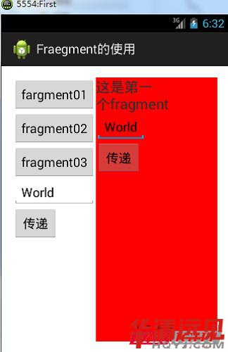 如圖,當我們在Fragment01的EditText中輸入World,點擊傳遞按鈕后,World就會顯示到主活動的EditText中