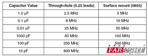 表1 列舉了兩種類型陶瓷電容的諧振頻率,一種是標準的0.25 inch 的插件電容, 3.75n H 的內部電感系數, 另外一種是貼片電容, 內部感應系數是1n H, 我們可以從表中看到貼片電容的諧振頻率是插件電容的兩倍左右.