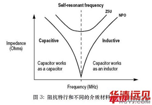 在諧振頻率之前, 電容還保持著電容的特性, 而大于諧振頻率時,由于引線長度和導線電感的影響, 電容的作用將變成電感的作用.