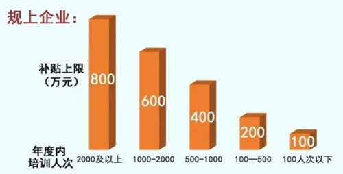 根據(jù)企業(yè)規(guī)模和年度內(nèi)訓(xùn)人次分檔、限額進(jìn)行補(bǔ)貼。企業(yè)組織職工開展技能提升培訓(xùn)且績效考核合格的,按照每人合計(jì)不超過2萬元的標(biāo)準(zhǔn)、不超過培訓(xùn)總費(fèi)用50%的比例,給予企業(yè)補(bǔ)貼。