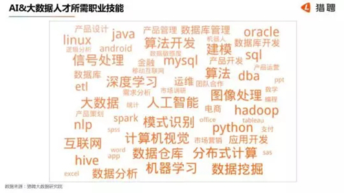獵聘大數(shù)據(jù)研究院分析了AI 與大數(shù)據(jù)人才所應(yīng)掌握的相關(guān)技能關(guān)鍵詞,結(jié)果發(fā)現(xiàn),這個(gè)領(lǐng)域?qū)θ瞬潘刭|(zhì)的要求較為綜合,不但要求相關(guān)的硬核技能,如人工智能、算法、互聯(lián)網(wǎng)方面的知識和技能,還要求懂得產(chǎn)品相關(guān)的知識儲備、數(shù)據(jù)分析、邏輯分析和市場營銷等技能。