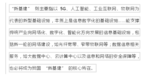 另外,在今年“兩會”,備受關(guān)注的新基建首次被寫入政府工作報告,報告指出要加強“兩新一重”建設(shè)。