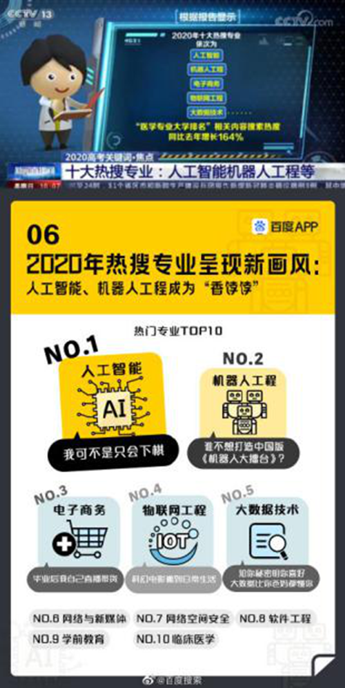 數(shù)據(jù)顯示,國家強基計劃實施,2020年十大熱搜專業(yè)中人工智能、機器人、物聯(lián)網(wǎng)位列熱搜專業(yè)前五,各類“科技范兒”十足的新興專業(yè)更受熱議和追捧,技術(shù)改變生活,大勢已不可逆轉(zhuǎn)!